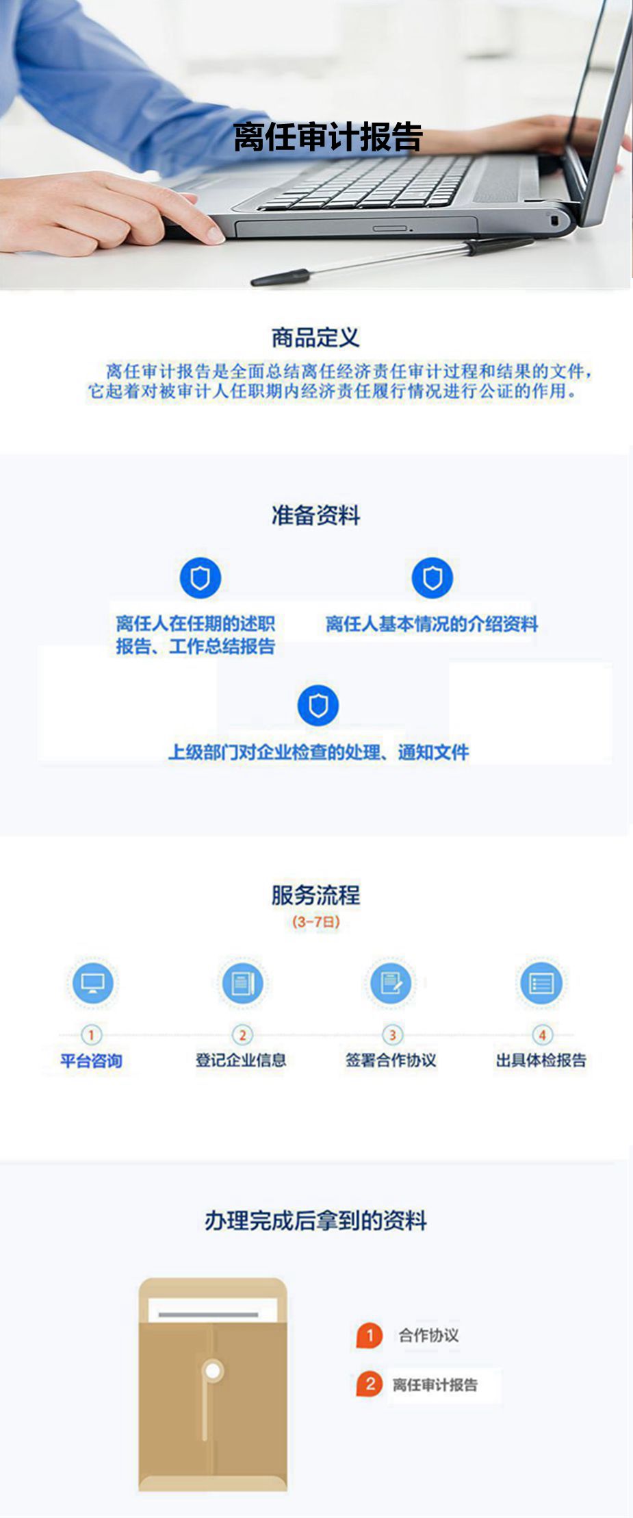 1.离任审计报告是审计人员根据审计准则的要求,在实施了必要的审计程序后出具的,对法定代表人任职期间经济责任的履行情况做出审计评价并提出审计建议的一种书面文件。